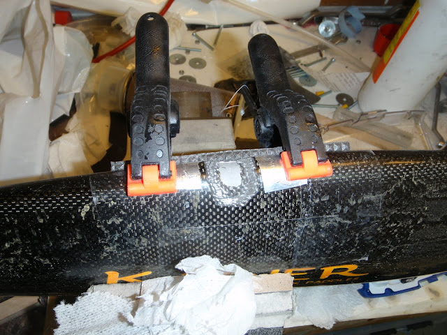 Jag började med att gjuta två passbitar, en på innersidan och en på yttersidan av paddeln. Passbitarna fungerar som mothåll och ger rätt form på lagningen. När bitarna hade härdat klart slipade jag ned det skadade partiet på paddeln för att få frisk kolfiber att laminera mot. Jag försökte få en gradvis ökning av tjockleken på det slipade området för att få yta att fästa de nya kolfiberremsorna mot. Den inre passbiten fixerades sedan med aluminiumtejp och klämdes fast med två klämmor med lite liggunderlag emellan.
